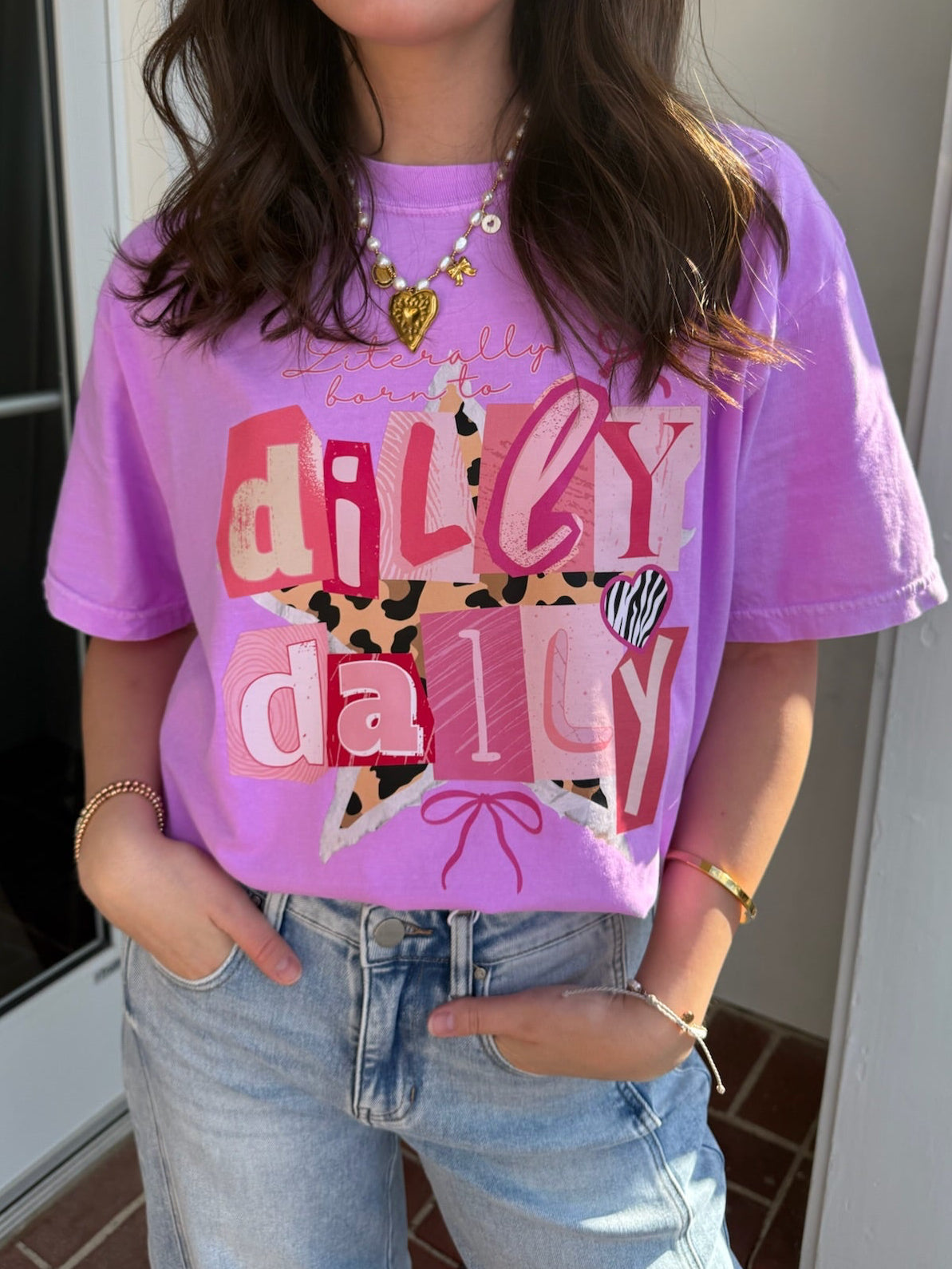 Embrace a laid-back vibe with this cotton tee featuring a playful "Born to Dilly Dally" graphic. Soft, breathable fabric makes it perfect for casual days—pair it with denim, shorts, joggers, or whatever feels right. A fun statement piece that celebrates taking life at your own pace, this tee works as a standalone style or layered under jackets for effortless versatility.
